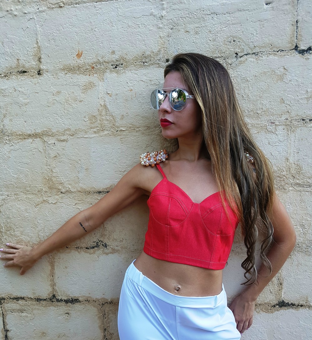 El lookete de ella en esta edición nos muestra crop top confeccionado en denim rojo, detalles de corte en la taza soft, breteles finos y hombreras bordadas a mano con perlas.