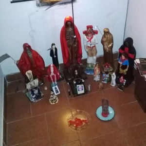 Esculturas del Gauchito Gil, Pomba Gira, San La Muerte, San Cayetano, Buda y Jesucristo, estaban distribuidas en el hogar en tres puntos fijos con platos para encender velas o dejar ofrendas.