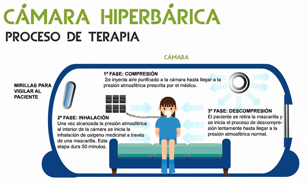 El tratamiento con Oxigenación Hiperbárica (TOHB) es un método no invasivo que consiste en suministrar oxígeno a altas concentraciones en una cámara hiperbárica presurizada a un mínimo de 1.4 atmósferas ATM (superior a la presión atmosférica ambiental normal que es de 1 atmósfera).
