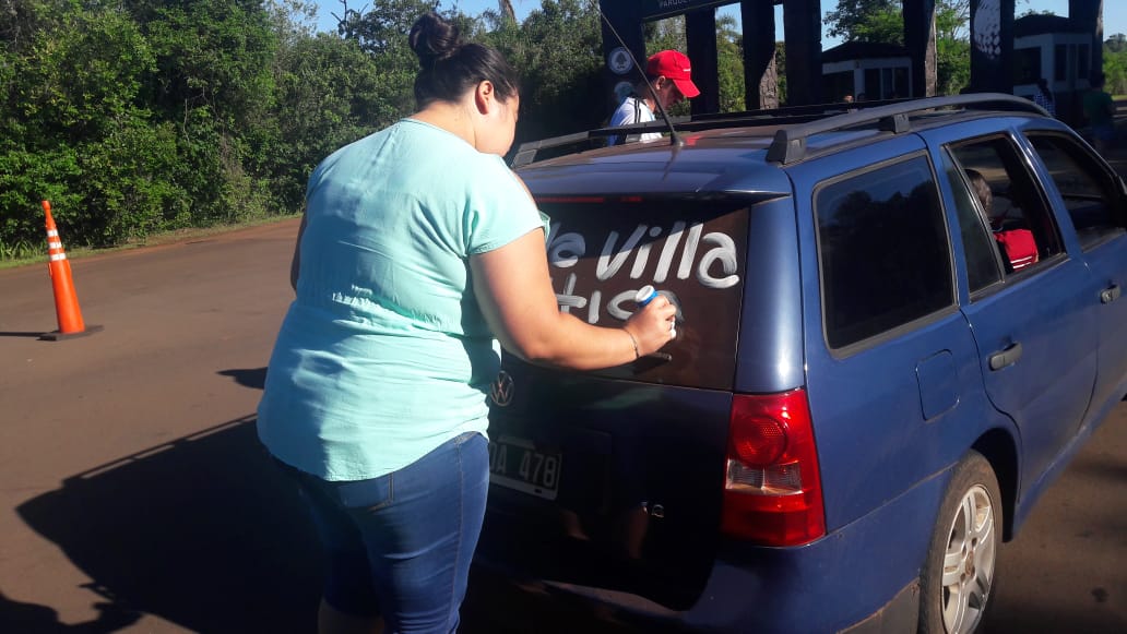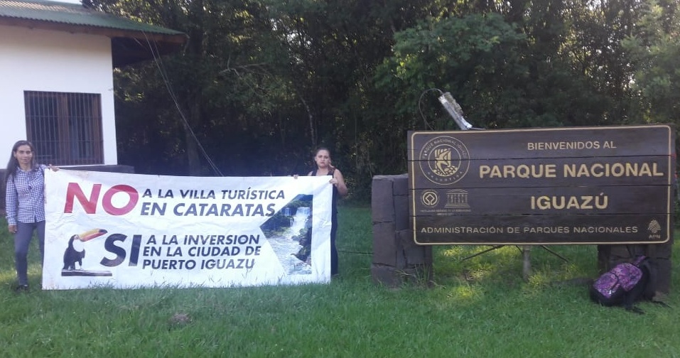 Integrantes de la Fundación Amigos de los Parques lleva adelante una jornada de concientización y entrega de folletos en el acceso a Cataratas para explicar sus razones por el rechazo a la villa turística dentro del Parque Nacional Iguazú (PNI).