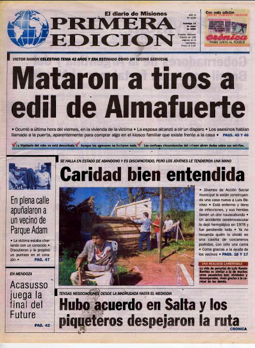 El primero de esos hechos tuvo, incluso, repercusión nacional. Sucedió cerca de las 22.45 del viernes 12 de mayo de 2000 en Almafuerte, donde el concejal de esa localidad, Víctor Ramón Celestino (42), fue asesinado de un escopetazo en el tórax.