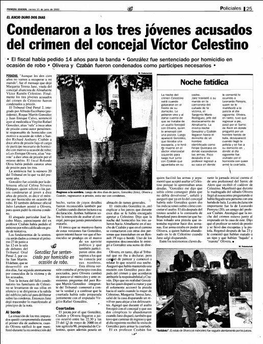 Alrededor de las 22.45 del viernes 12 de mayo de 2000 tres jóvenes se hicieron pasar por clientes y golpearon las manos en el portón del edil Víctor Ramón Celestino (42), en Almafuerte. Dijeron querer comprar vino pero, en un descuido del funcionario, dos de ellos lo interceptaron.