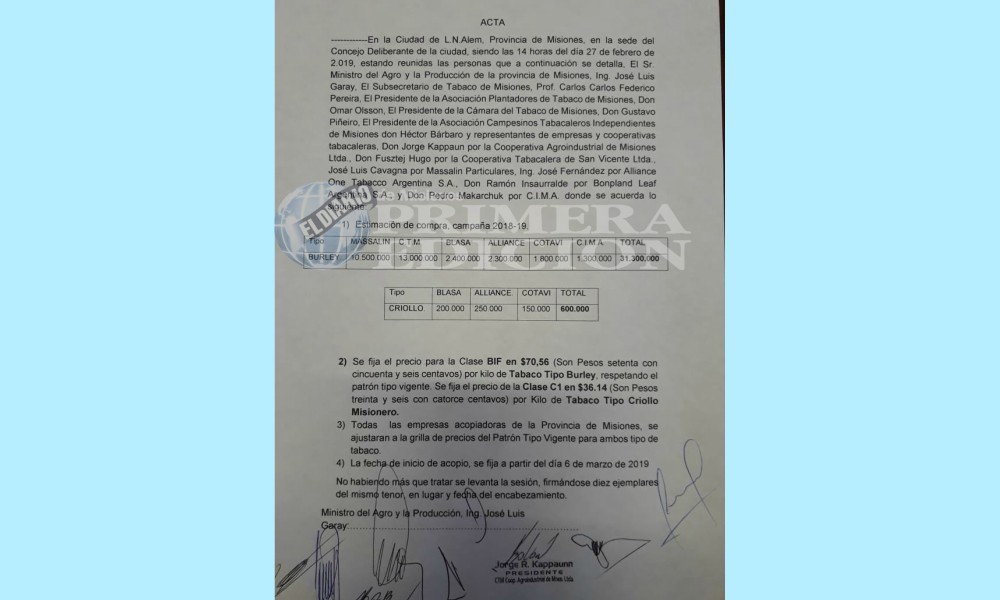 El presidente de la Asociación de Plantadores de Tabaco de Misiones (APTM), Omar Olsson, comentó su satisfacción por el acuerdo, pero admitió que pretendían un precio mayor.