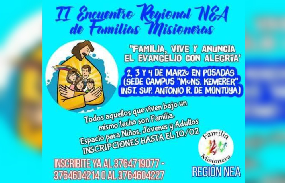 Bajo el lema “Familia, vive y anuncia el Evangelio con Alegría”, este sábado 2 de marzo, a partir de las 18, el campus “Monseñor Jorge Kemerer” del Instituto Superior Antonio Ruiz de Montoya de esta ciudad recibirá a unas 30 familias (150 personas) llegadas desde las diócesis de todo el Nordeste argentino para el inicio del II Encuentro Regional NEA de Familias Misioneras, que se extenderá hasta el lunes.