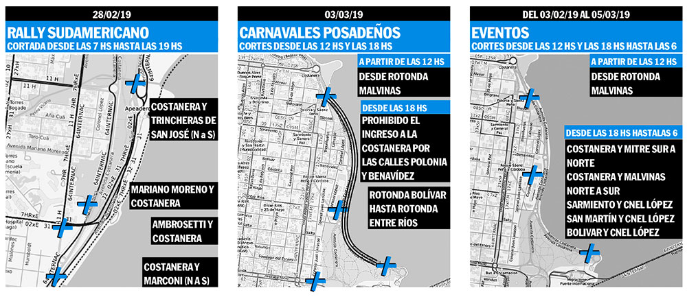 De cara a los corsos, desde las 12 del domingo no se podrá circular por la costanera desde la rotonda por los caídos en Malvinas y la rotonda de Bolívar hasta la de Entre Ríos. Desde las 18 habrá corte total desde Mitre hasta Malvinas y no se podrá ingresar desde Polonia ni Benavides.