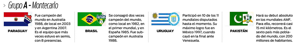 Sobre los otros grupos, todos coincidieron en que el A se transformó en “la zona de la muerte”. Sucede que Paraguay (triple campeón del mundo), Brasil (bicampeón) y Uruguay (siempre difícil) coincidieron en la zona junto a Pakistán, uno de los misterios que tiene la copa. Esa serie se disputará íntegramente en Montecarlo.