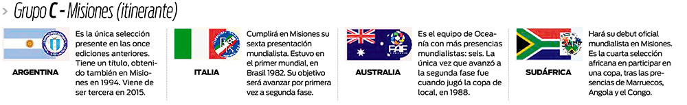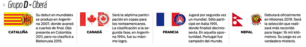 Finalmente, con respecto a la zona D, que tendrá como sede la Capital del Monte, el único europeo que fue cabeza de serie, Cataluña, debutará ese mismo lunes ante Francia, mientras que Canadá hará lo propio con Nepal, otro de los misterios que por el momento tiene el Mundial Misiones 2019, que anoche finalmente comenzó a tiñar la provincia con el color del futsal.