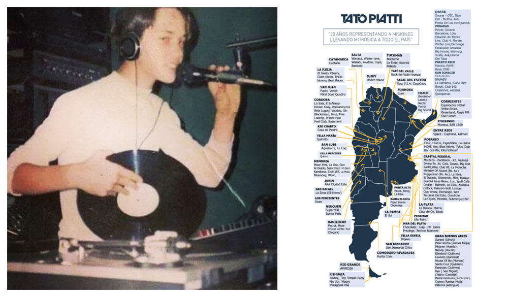 “Tenía ocho años y jugaba a mezclar discos de música electrónica, de house y algunos hits que se escuchaban en esa época. A los doce un grupo de chicos, amigos suyos, todos mayores de 18, me invitaron al Oberá Tenis Club a pasar música en una batalla de DJ, de moda en ese entonces. Así arranqué, a mucha gente le llamó la atención ver a un niño mezclando bandejas, entre ellos al dueño de Soucer y la particularidad era que en esa época no estaba prohibida la entrada a menores de 18 en las discotecas, tuve esa suerte, entonces, siempre acompañado por mi hermano, mis padres me dejaban ir a musicalizar”, recordó Piatti a Ko´ ape.