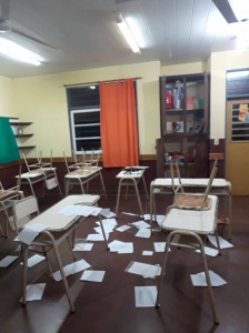 Los intrusos no se llevaron nada, pero rompieron mucho. Desenroscaron los focos que se encuentran frente a la puerta de sala de maestros y así pudieron forzar la puerta sin ser vistos