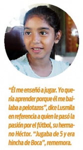 En esa complicidad de hermanos le transmitió la pasión por el fútbol y la niña está decidida a cumplir el sueño que Héctor no pudo. “Él decía que quería ser un gran futbolista. Y jugaba muy bien”, recuerda Marisa. “Jugaba de 5 y era hincha de Boca”, agrega Lusmila, que juega de 9 y también es hincha de Boca, pese a que la mamá es de River.