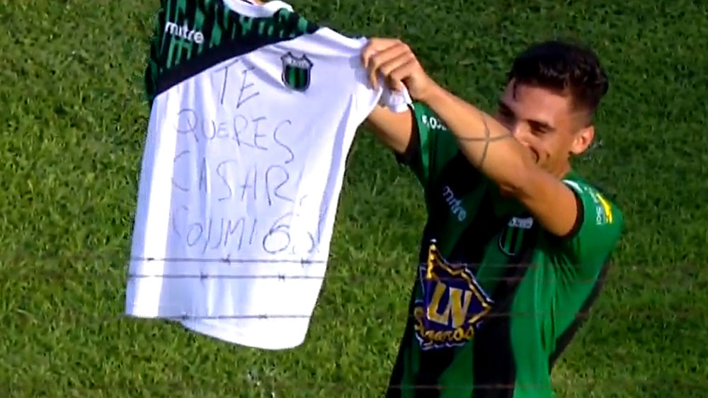 Iban 36 minutos del PT cuando festejó el tanto y salió disparado hacia un cómplice que ya tenía la remera lista y se la mostró a su novia Micaela que festejaba en las gradas.