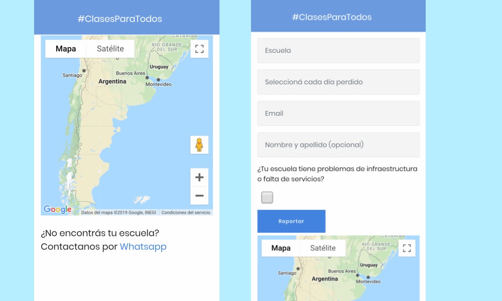 En esta web se pueden reportar los días de clase perdidos en cualquiera de las escuelas que figuran en el listado público de escuelas publicado en la web del Ministerio de Educación, Cultura, Ciencia y Tecnología de la Nación.