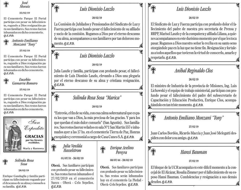 Fúnebres del viernes 1 de marzo de 2019