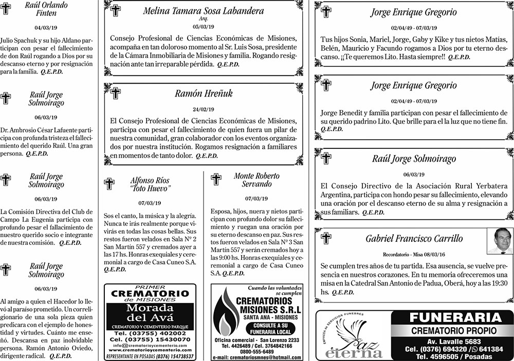 Fúnebres del viernes 8 de marzo de 2019