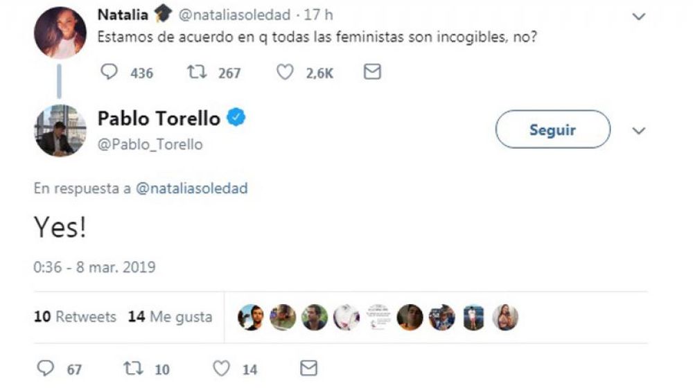 “¿Estamos de acuerdo en que todas las feministas son incogibles, no?”, publicó una usuaria de Twitter, ante lo cual Torello respondió: “Yes”.