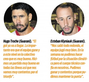 Antes de que se cumpla el primer minuto de juego, Guaraní avisó que la parada no sería para nada fácil: un tiro de Gabriel Díaz se fue cerca del arco defendido por Gustavo Acosta. Sólo nueve minutos aguantó la defensa visitante, que se enfrentó a un Hugo Troche endemoniado, metido al 100% en el partido, que jugó e hizo jugar.