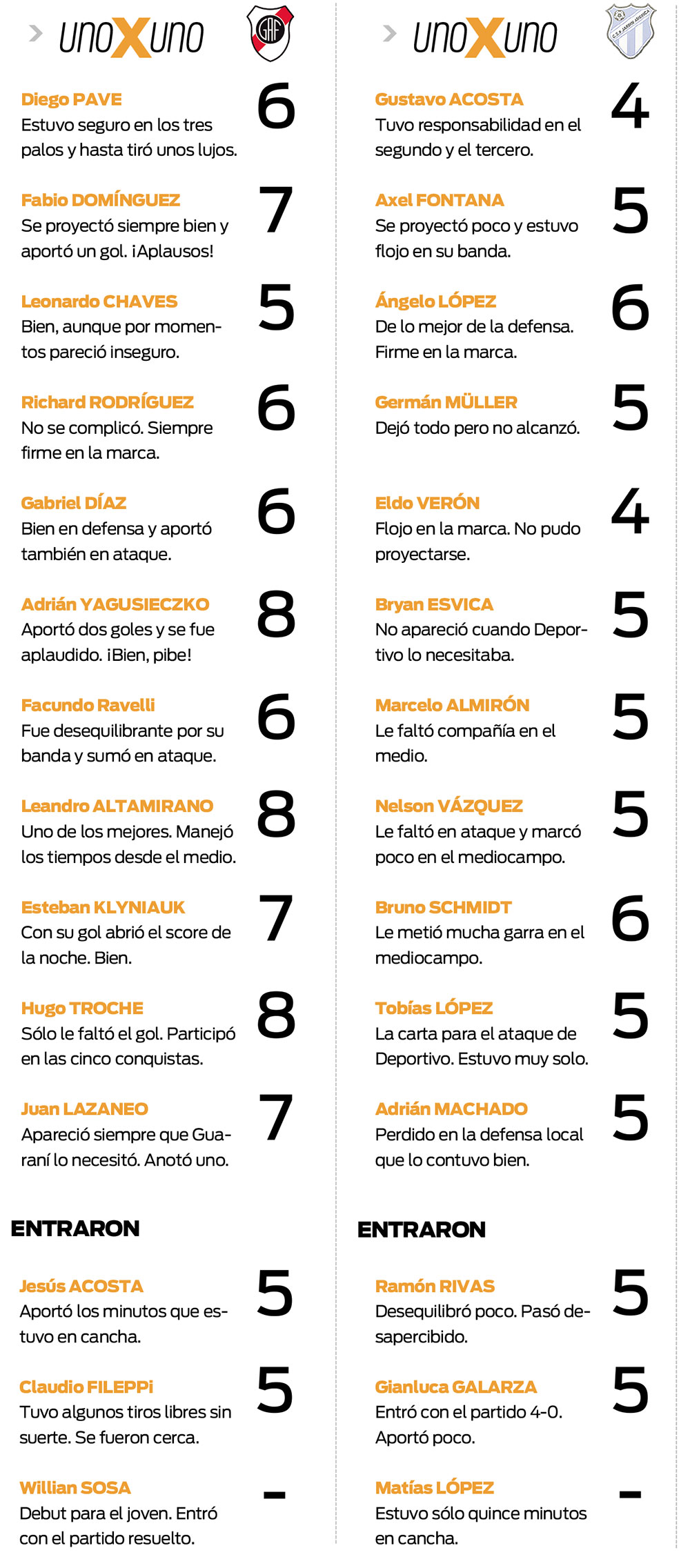 A los 13 Troche, siempre Troche, metió un centro desde la derecha que bajó Díaz y sirvió un centro atrás que Adrián Yagusieczko cambió por gol. 4-0 frente a un Deportivo que no le encontró la vuelta a un Troche encendido. A los 26, otra vez Yagusieczko para redondear el 5-0 final que dejó a los hinchas con las manos rojas de aplaudir.
