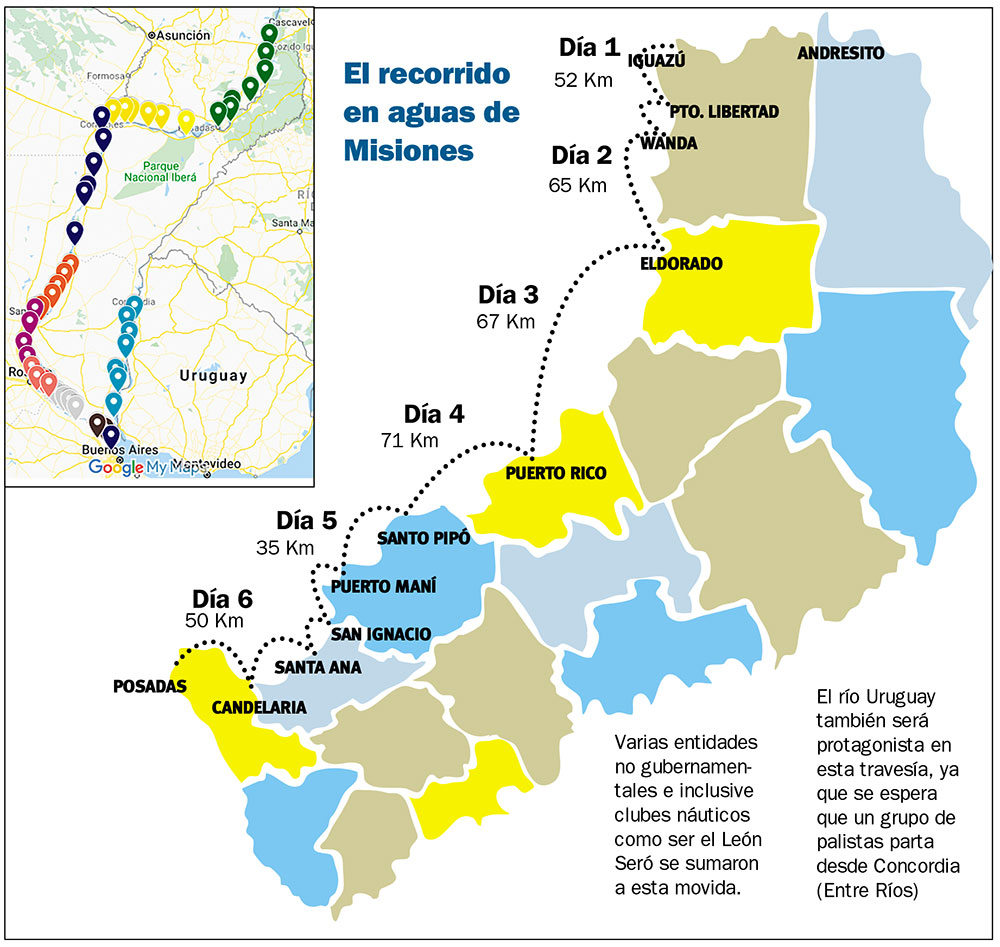 Sobre el río Paraná se realizarán distintas postas a lo largo de seis días. La primera parada será Puerto Libertad y luego Wanda, Eldorado, Puerto Rico, Santo Pipó, Puerto Maní, San Ignacio, Santa Ana, Candelaria y Posadas. La distancia más larga será de unos 70 kilómetros y las más cortas, de 50 kilómetros.