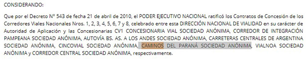 Cabe destacar que en la Resolución 437/2019, donde se autorizaron los aumentos en los corredores viales 2, 3 (tramos incorporados del exCorredor Vial Nº 7), 4, 6 y 8, se ratifican los contratos de concesión a varias empresas, entre ellas a Caminos del Paraná SA que maneja el peaje de la ruta nacional 12.