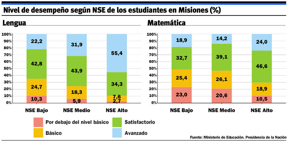 En tanto, en matemática el 53,8% de los estudiantes de esta jurisdicción alcanzan niveles de desempeño Satisfactorio o Avanzado, y el 20,9% de los estudiantes se encuentra por debajo del nivel básico. Pero, en Misiones, el nivel de desempeño en lengua es mucho menor entre los chicos con Nivel Socioeducativo (NSE) bajo: sólo el 65% (27,7% menos que sus pares de NSE alto) alcanza niveles de desempeño Satisfactorio/Avanzado mientras que un 10,3% se ubica por debajo del nivel básico (sólo el 2,7% de los chicos del NSE alto están en esta categoría).
