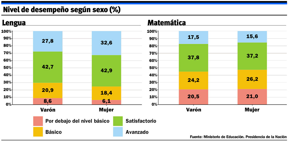 En matemática, en cambio, se observa que un 55,3% de los estudiantes varones alcanza niveles de desempeño Satisfactorio/Avanzado, mientras que un 20,5% se ubica por debajo del nivel básico.