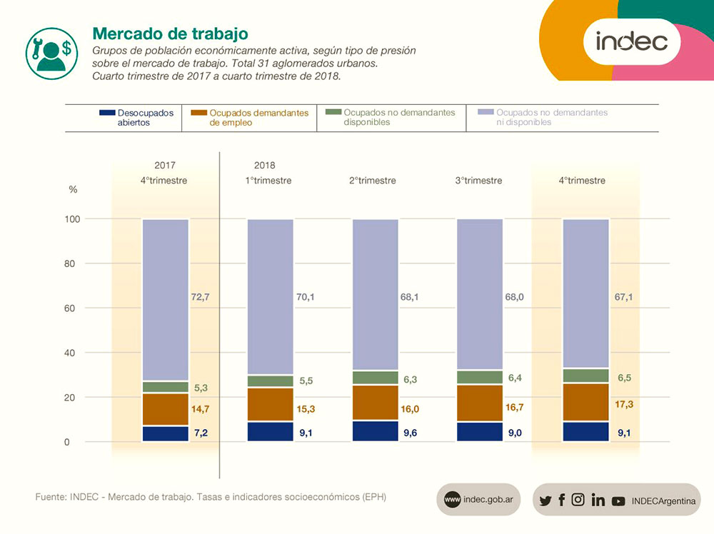 Según el organismo, los resultados del cuarto trimestre de 2018 correspondientes al total de aglomerados urbanos muestran que la tasa de actividad es del 46,5%, la tasa de empleo es del 42,2% y la tasa de desocupación alcanza el 9,1%.