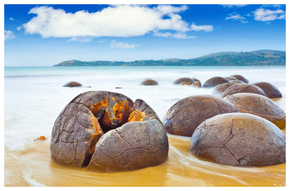 Moeraki Boulders. Este conjunto de rocas redondeadas son del gusto de los cientos de turistas que cada año visitan la zona. Algunas de ellas son tan grandes que llegan a medir tres metros y pesar varias toneladas, lo que las hace muy populares entre los fotógrafos que llegan al lugar.