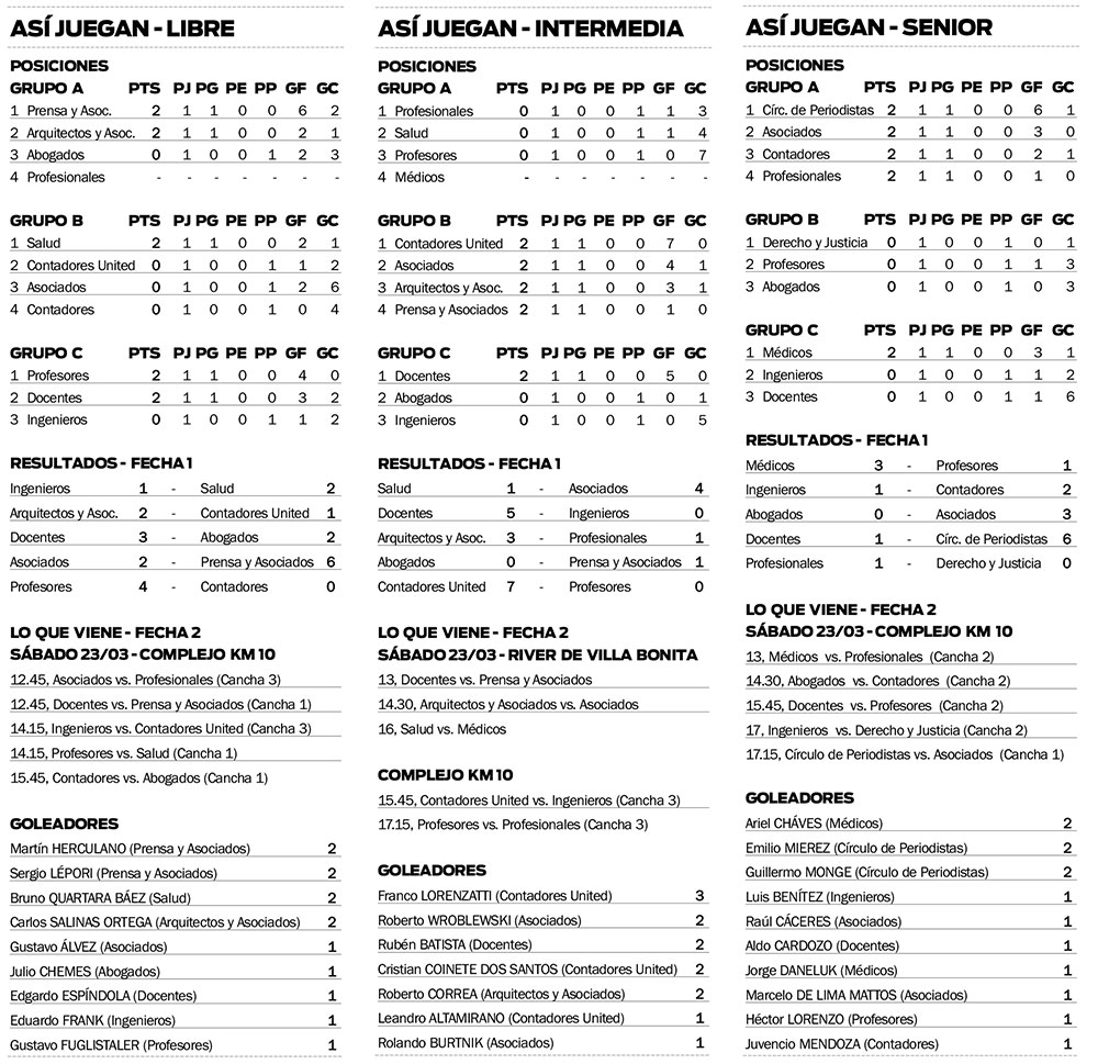 El descuento de los educadores fue convertido por Aldo Cardozo. A su turno, Asociados también arrancó con un triunfo, frente a Abogados. Fue 3-0 y los goles fueron obra de Marcelo De Lima Mattos, José Zapani y Raúl Cáceres.