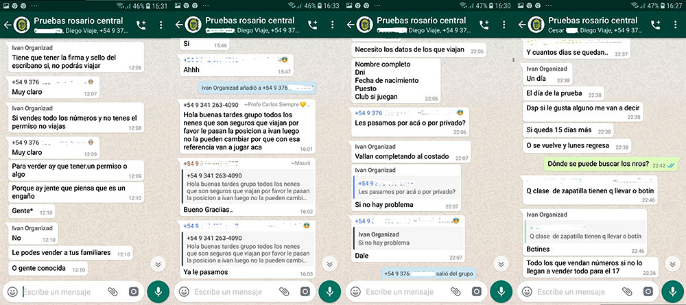 El paso siguiente fue armar un grupo de Whatsapp “Pruebas Rosario Central”, en el que el supuesto coordinador les informaba cómo iba ser el traslado y que los menores de edad debían sacar un permiso ante un juez de paz o escribano público. Para los que no podían pagar el monto les ofreció vender 20 números de una rifa a 150 pesos cada una, por órdenes de compra de 8 mil, 5 mil y tres mil pesos. Los que lograban vender todo no pagaban el pasaje.