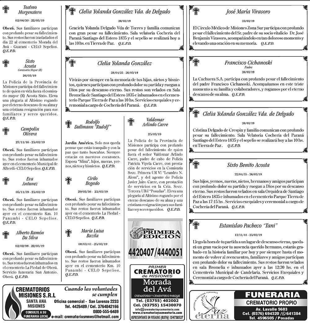 Fúnebres del miércoles 27 de marzo de 2019