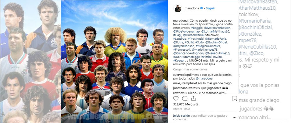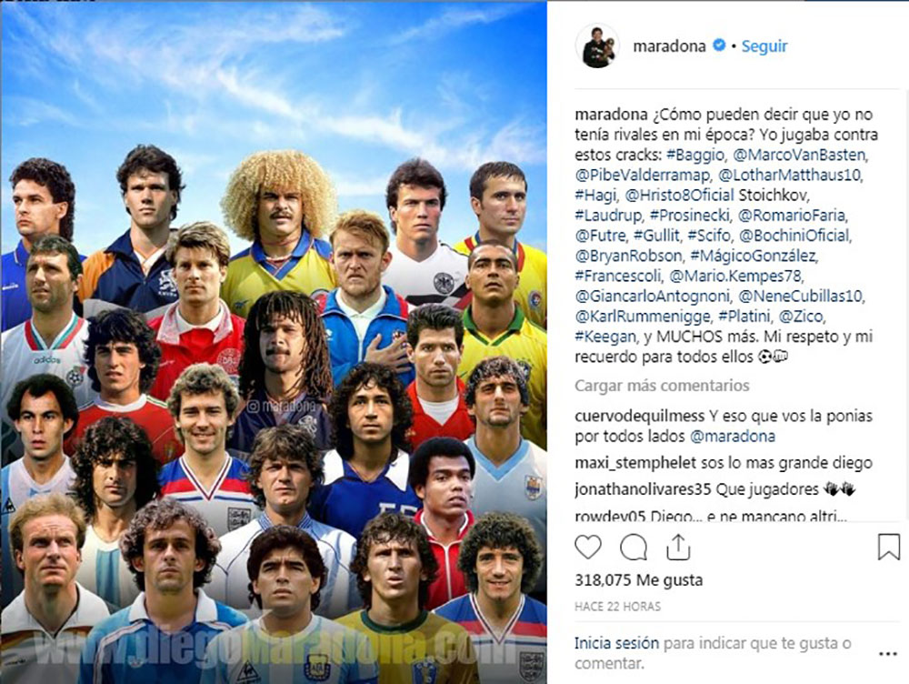 En este caso, en su cuenta de Instagram (@maradona), publicó un collage en el que se lo ve a él rodeado de figuras del fútbol internacional como el Pibe Valderrama, Ricardo Bochini, Mario Kempes, Roberto Baggio, Lothar Matthaus, Romario, Zico, Hirsto Stoickov, George Hagi, Marco Van Basten, Romario, Platini, Enzo Francescoli y varios más.
