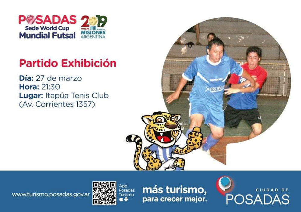 En el marco de las actividades de promoción por el Mundial de Futsal que se llevará adelante en Misiones, el gobierno de la ciudad invita a participar de un partido de exhibición hoy, miércoles 27 de marzo, desde las 21.30 horas, en el Itapúa Tenis Club, ubicado en la avenida Corrientes N°1357.