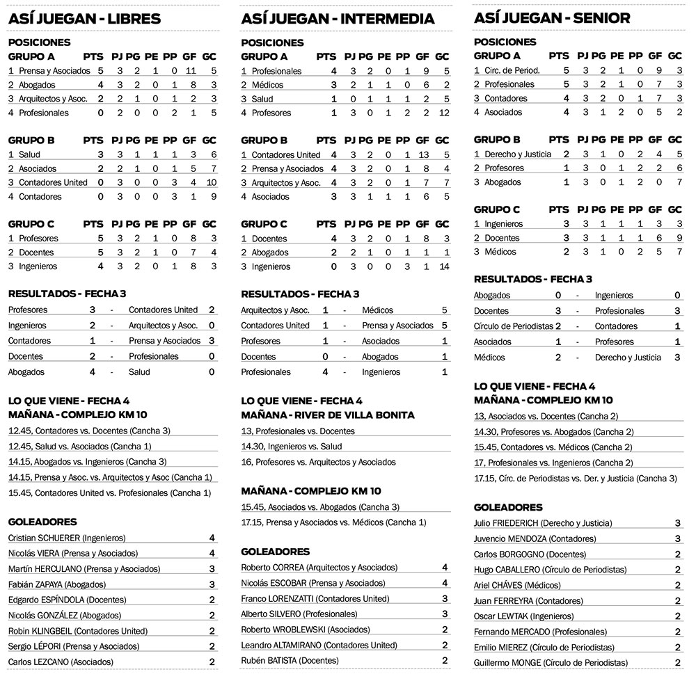 En tanto, en Intermedia, arriba se encuentran Profesionales, Contadores United, Arquitectos y Asociados, Docentes y Prensa y Asociados, mientras que en Senior el Círculo de Periodistas y Profesionales sacaron ventajas sobre el resto y encabezan el clasificador.