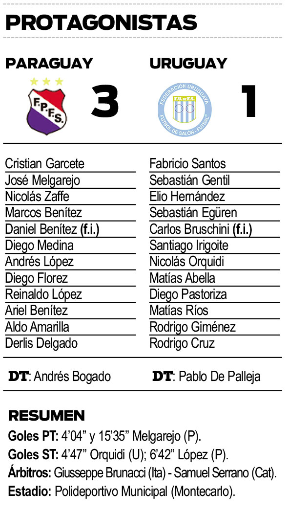 El primer tiempo comenzó peleado. Pero sólo 4’04’’ tardó Paraguay en inclinar la cancha a su favor. Una salida rápida se convirtió en un contraataque letal y Cachito Melgarejo, uno de los goleadores de la noche, decretó el 1-0 a favor del subcampeón mundial.
