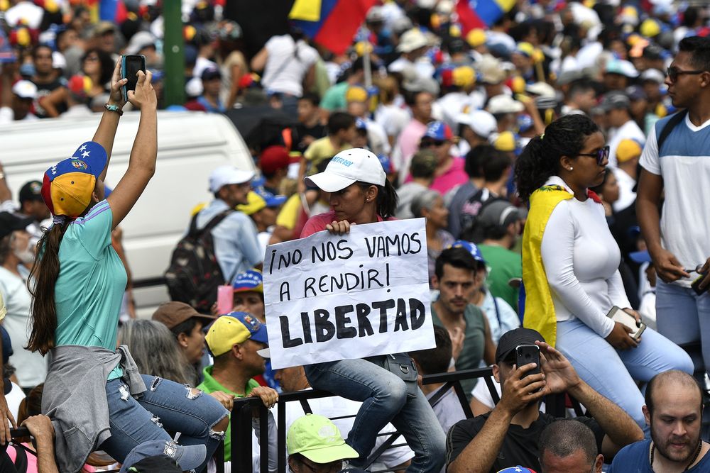“¡Aquí estamos, aquí vamos a seguir! ¡Todos a las calles, a la fase definitiva del cese de la usurpación!“, arengó el jefe del Parlamento, de mayoría opositora, desde la plataforma de un camión.