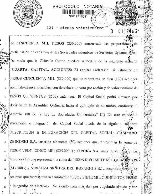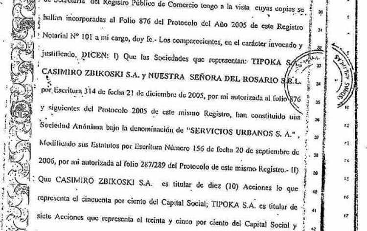 Gracias a una denuncia hecha en la Legislatura Provincial en el año 2014, se conoció que “en 2007 inscribieron la empresa Servicios Urbanos SA en el Registro Público de Comercio y en el acta constitutiva, que es un acta de Escribano, consta que quienes fundaron la empresa”, son: Don Casimiro, Tipoka y Nuestra Señora del Rosario.