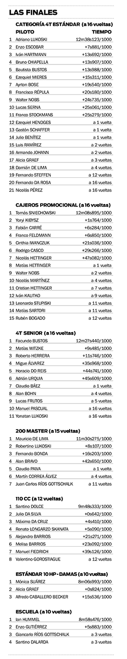 Por su parte, en la clase 4T Senior, Facundo Bustos regresó con todo. Tras cumplir con un sábado excelente, ayer reivindicó su categoría en la serie y posteriormente en la final. Claro que no le fue sencillo al apostoleño, ya que Alan Bohn planteó una dura pelea por el primer lugar casi hasta el final. Sólo un inconveniente mecánico dejó afuera al piloto de Cerro Azul y allanó el camino para el ganador.