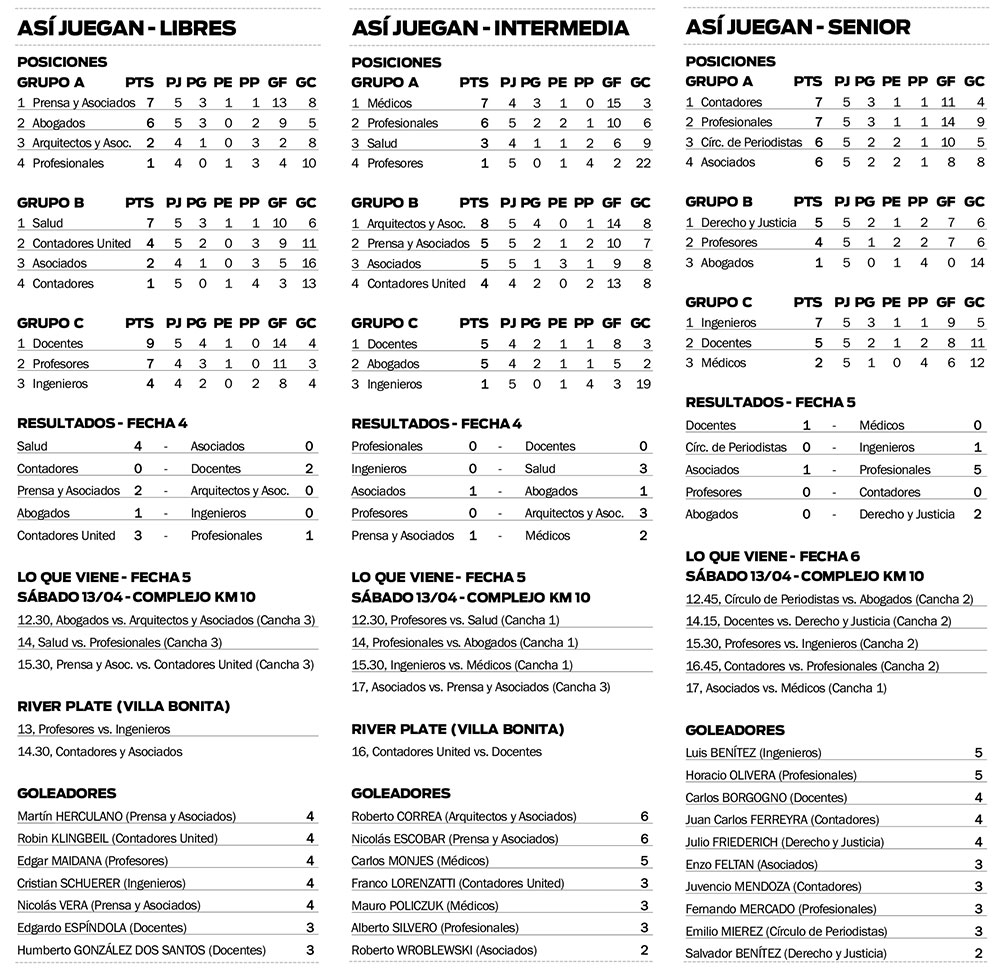 En lo que respecta a la categoría Senior, el triunfo más notable del sábado fue el que consiguió Profesionales sobre Asociados. Los dos puntos se quedaron para los “pro”, que vencieron por 5-1 con una tarde excepcional de Horacio Olivera, que se despachó con los cinco goles del equipo (uno más y acuñaba un increíble “doble hat trick”). Y eso que Raúl Cáceres había abierto el marcador para Asociados.