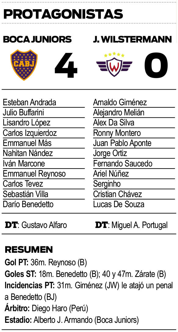 Emanuel Reynoso abrió la cuenta en el primer tiempo, a los 35 minutos, mientras que en el segundo, Darío Benedetto, de penal, Mauro Zárate y Alex Silva, en contra, a los 18, 39 y 47 minutos, respectivamente, ampliaron la diferencia para el local.