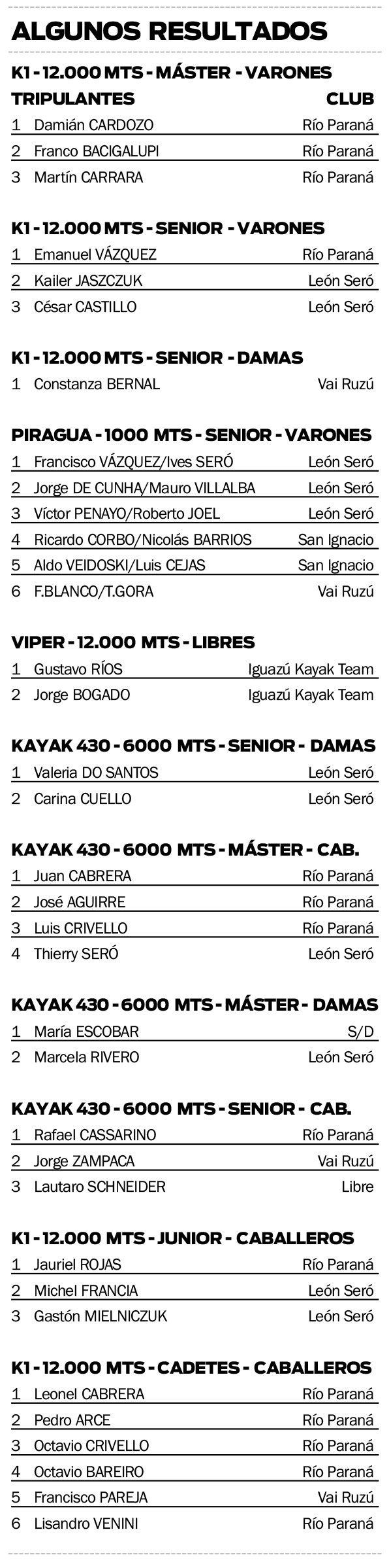 Entre las pruebas más atrayentes se destacó el triunfo de Emanuel Vázquez en la maratón de 12 kilómetros, en la categoría Senior, mientras que en mujeres el triunfo fue para la palista Constanza Bernal, del club Vai Ruzú.