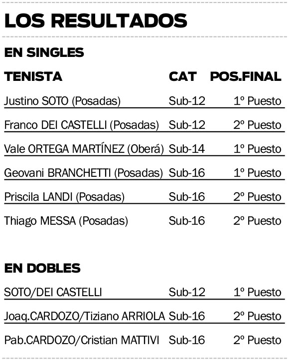 De regreso a Resistencia, entre los varones, los posadeños Justino Soto y Franco Dei Castelli consiguieron el primero y segundo puesto en Sub-12 pero, además, ambos se quedaron con el subcampeonato en dobles.