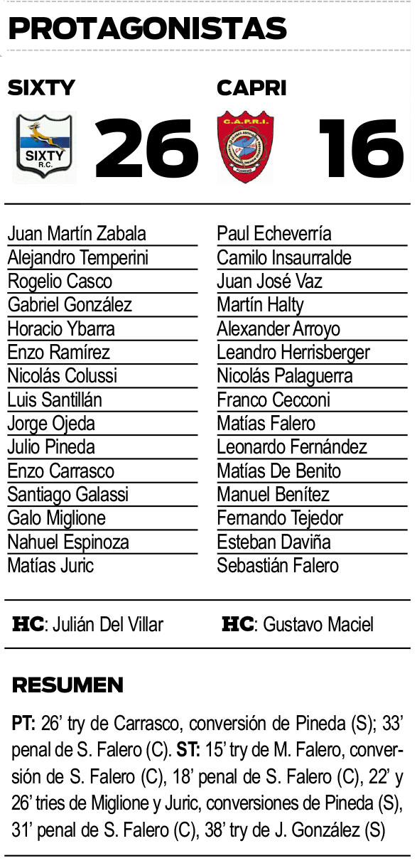 Completando la sexta fecha del Torneo Regional NEA de rugby, Sixty en su reducto de Villa Fabiana dio cuenta de CAPRI por 26 a 16, en un partido chato, discreto, plagado de errores e imprecisiones, y que se lo llevó el equipo chaqueño por aprovechar mejor los errores del rival.