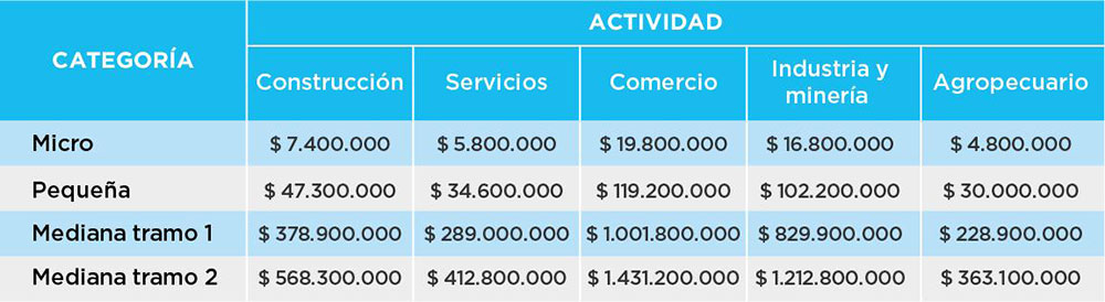 En la actividad de la construcción, el tope para la micro es de $ 12.710.000; de la pequeña, de $ 75.380.000; de la mediana tramo 1, $ 420.570.000; y del tramo 2, $ 630.790.000.