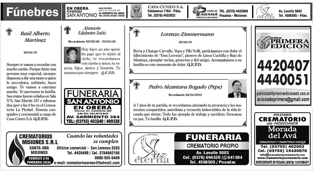 Fúnebres del lunes 22 de abril de 2019