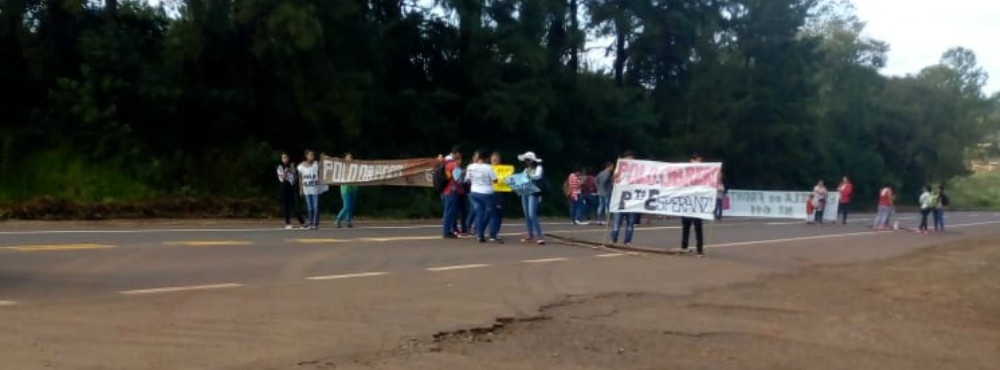 Un grupo de aproximadamente 30 personas, padres de alumnos de la Escuela 611, realizan un corte total de la ruta nacional 12, a la altura del kilómetro 1587, sobre la avenida Amans Laka, en el acceso sur a Puerto Esperanza.