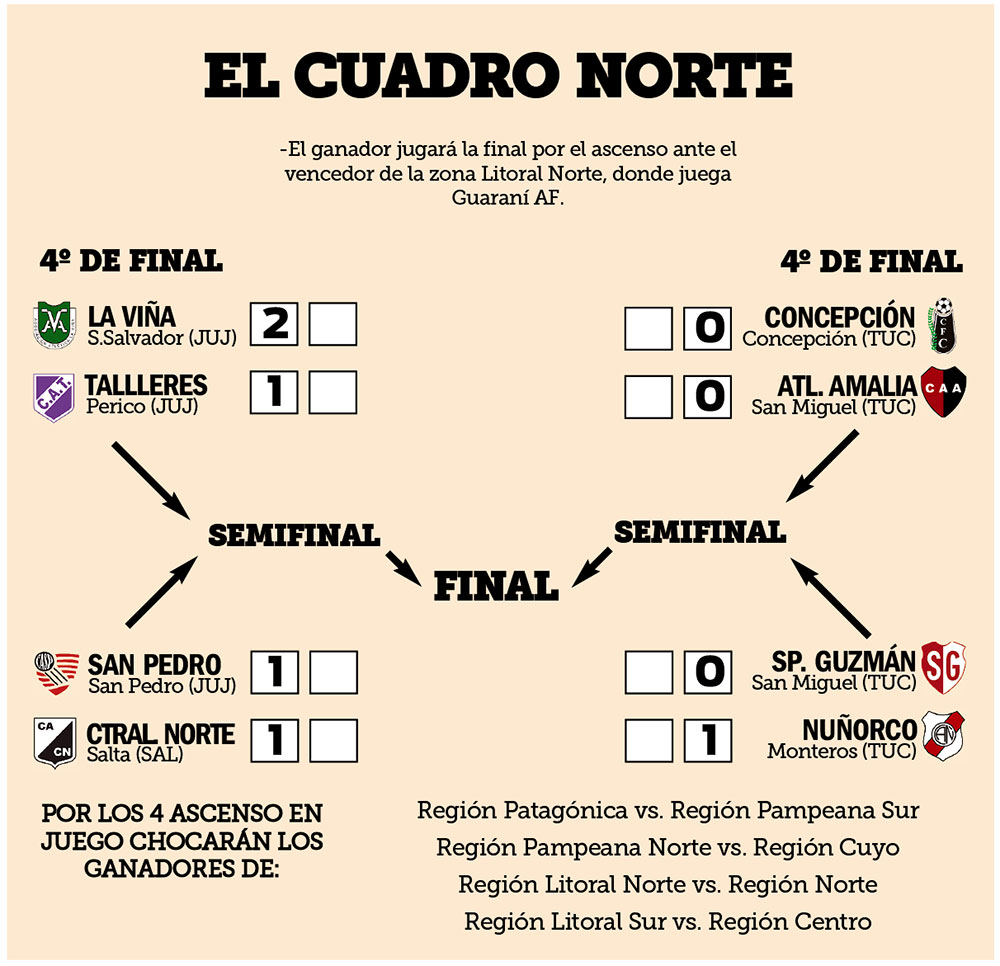 Hace exactamente una semana, el Consejo Federal de AFA publicó el despacho 12.479, que determinó cómo serán esos cruces, en busca del ascenso. Así, el ganador de la Región Litoral Norte -que podría ser Guaraní- no jugará con el vencedor de la zona Litoral Sur -como se preveía y parecía lógico en virtud de la cercanía geográfica- sino con el vencedor de la Región Norte, conformada por equipos de Salta, Jujuy y Tucumán.