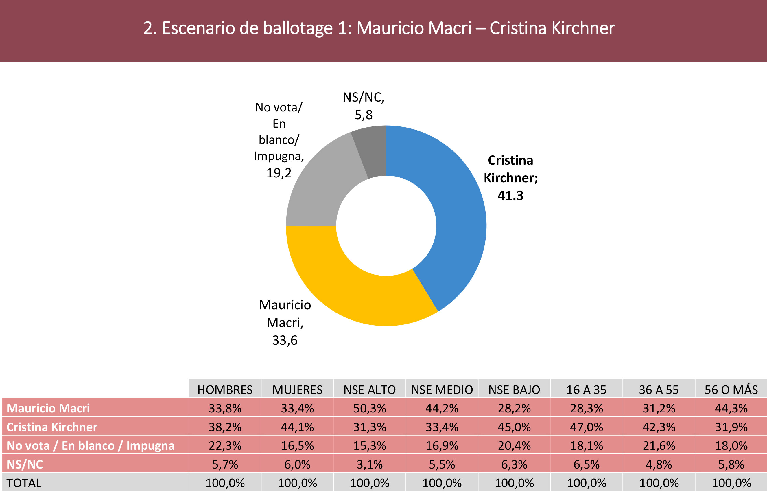 La expresidente ganaría por casi ocho puntos de diferencia, con 41,3% contra 33,6% de M. Macri. Pero este no parece ser un