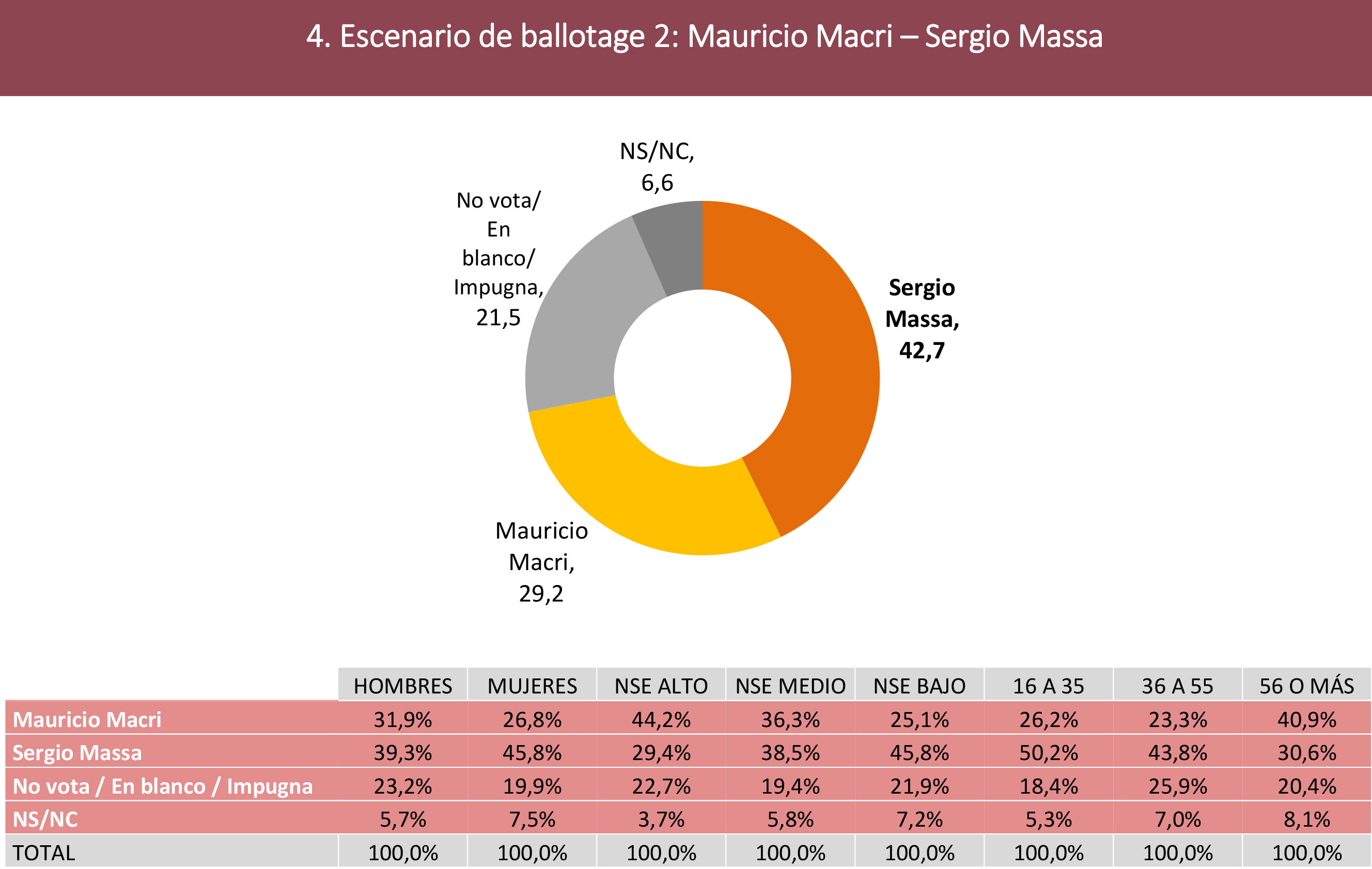 Massa se impone a Macri por una diferencia ligeramente superior a la de la expresidente, 42,7% a 29,2%, y el porcentaje de aquellos que dicen no votar o hacerlo en blanco aumenta en dos puntos porcentuales.