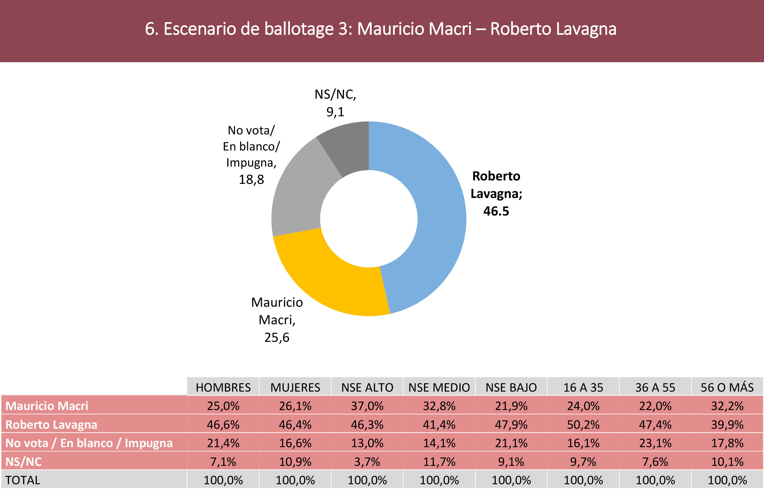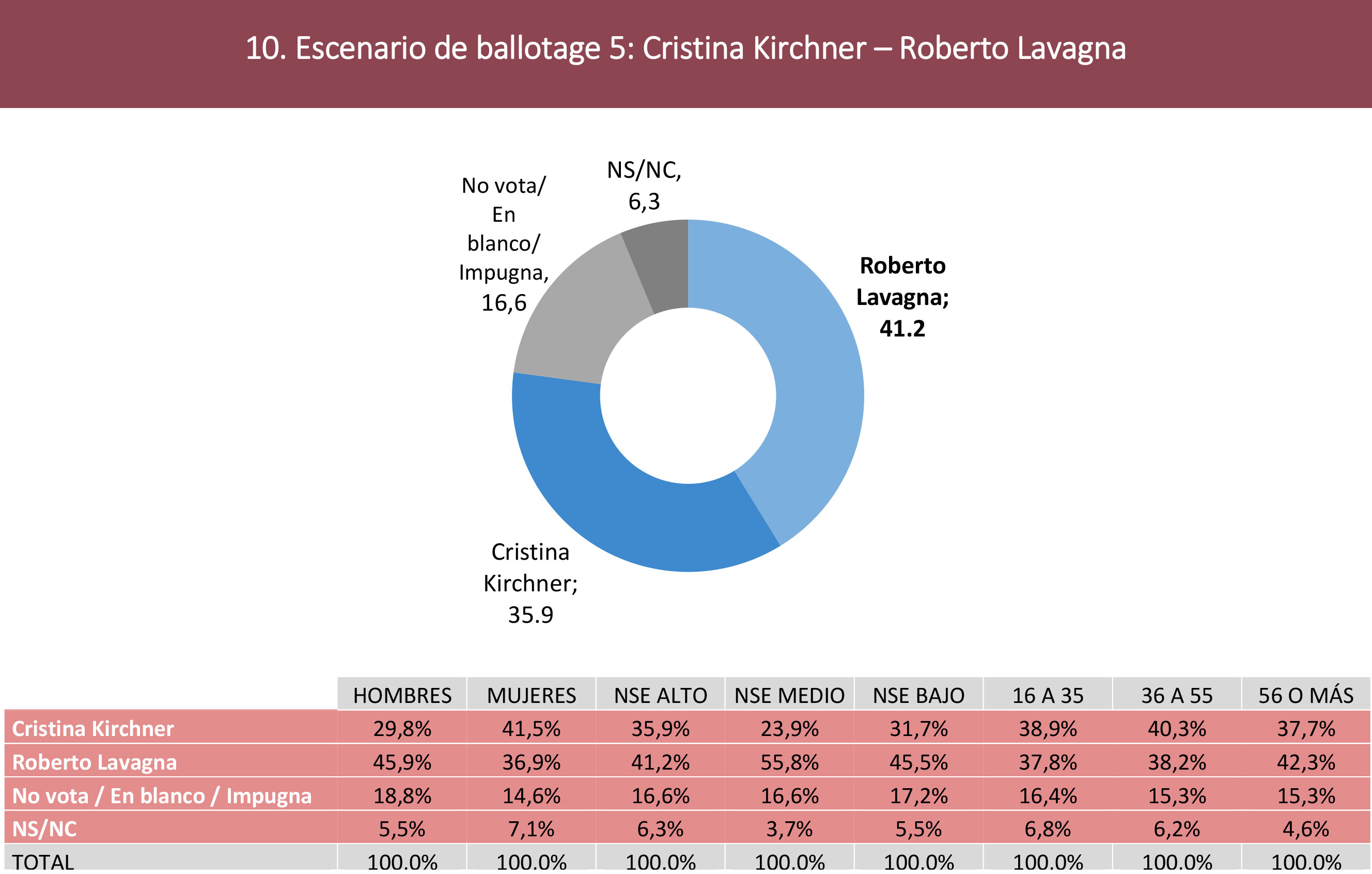 alcanzaría Lavagna. En este escenario también resulta alto el porcentaje de votantes en blanco, que llega al 18,8%.