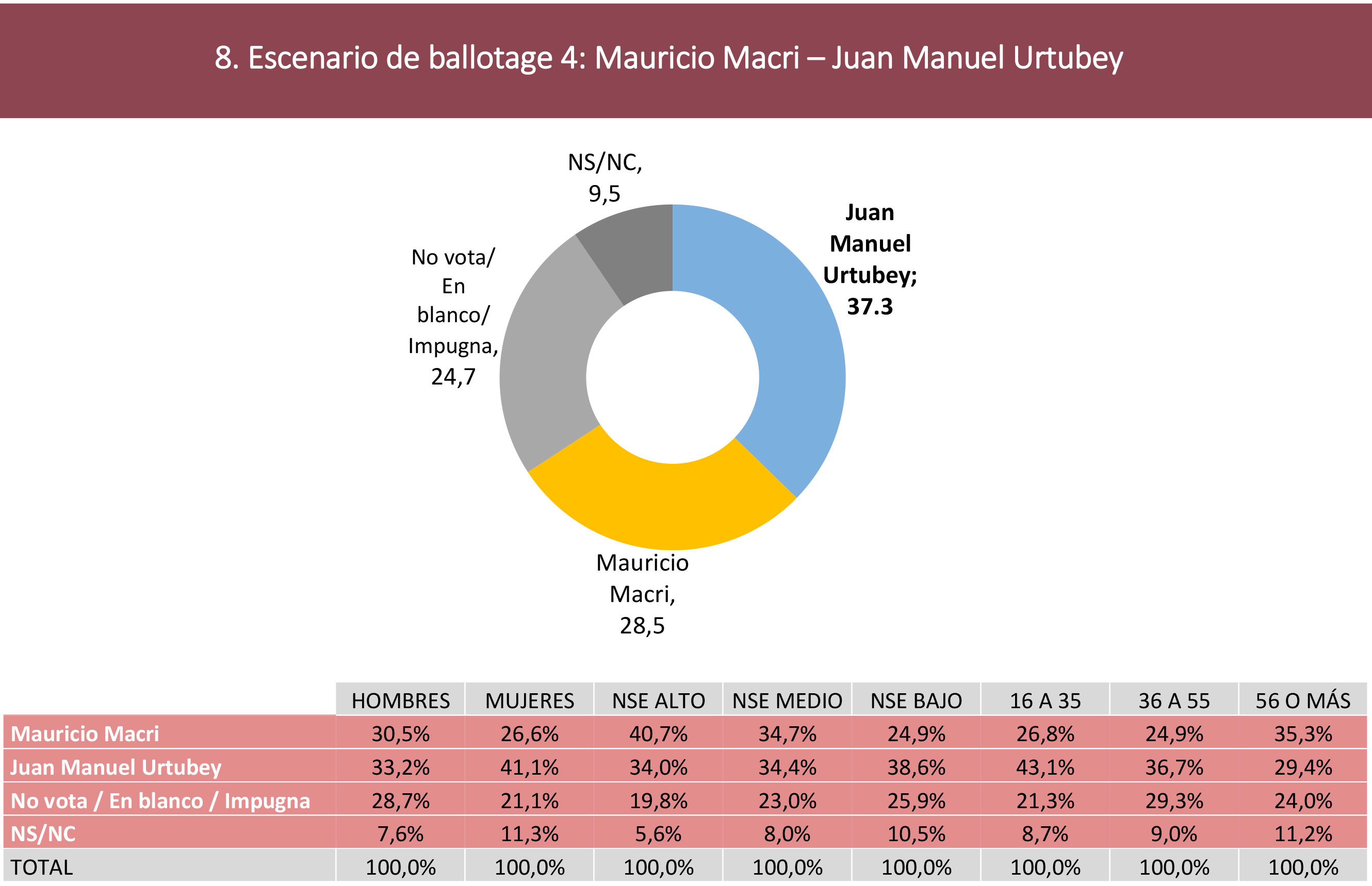 Frente al Gobernador de Salta, Macri registra algunas décimas menos que en el escenario anterior, alcanzando el 28,4% de las preferencias, mientras que Urtubey registra 37,3% de los votos. El 24,8% sostiene que no votaría en este escenario o que lo haría en blanco.